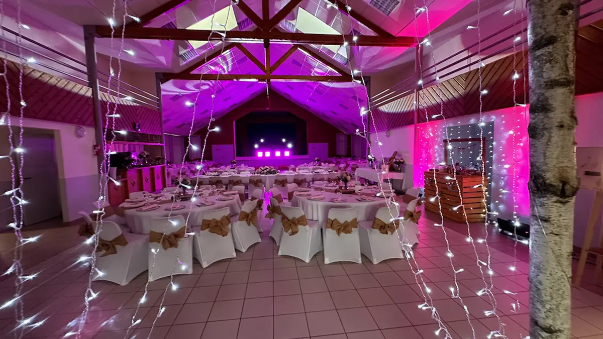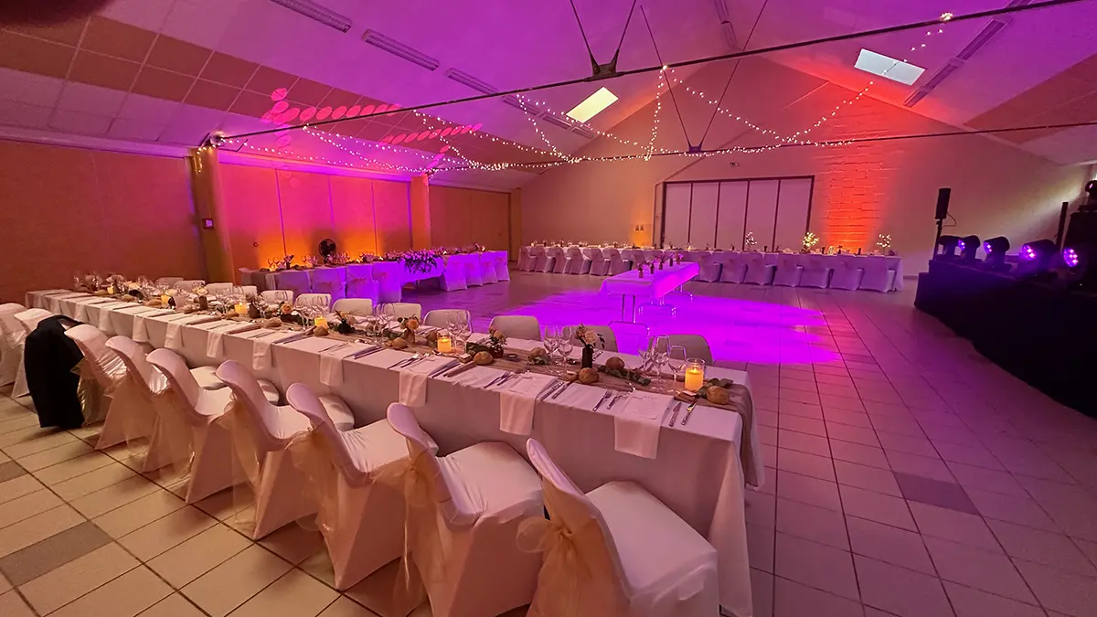 Matériel professionnel et adapté — Sonorisation, éclairage, micros, options pour vin d’honneur ou repas, possibilité de s’adapter à la taille de votre salle et au nombre d’invités : tout est prévu pour garantir une qualité optimale.